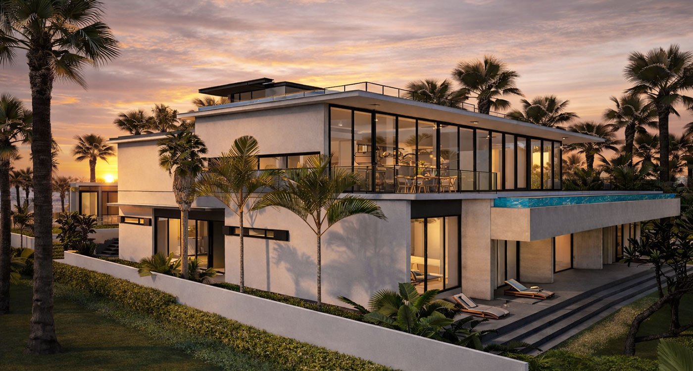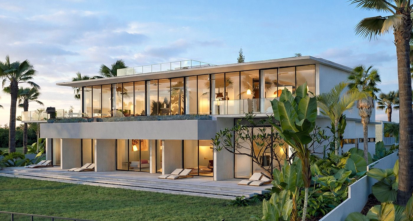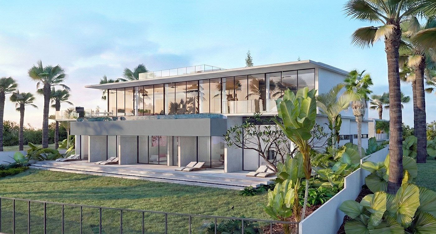 A defining feature of the villa is its vast second-floor terrace, where a spectacular infinity-edge pool stretches toward the horizon. Floor-to-ceiling sliding glass doors allow the living room and master bedroom to open entirely to this outdoor sanctuary, blurring the lines between interior and exterior. Above, a sundeck crowns the rooftop, offering panoramic views of the golf course and surrounding landscape.