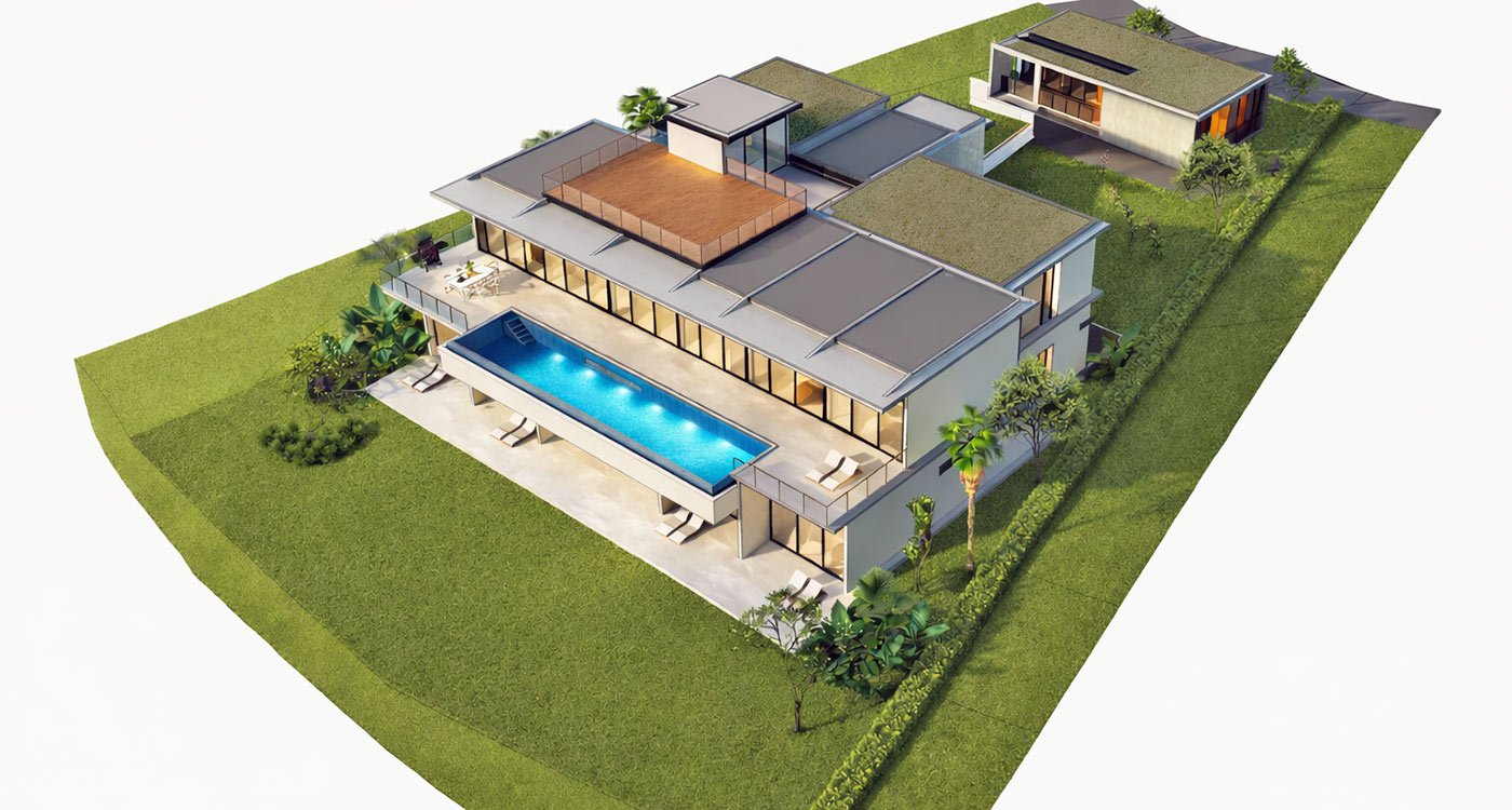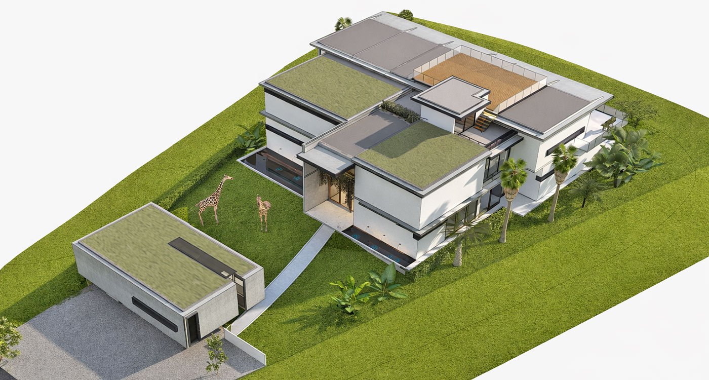 At street level, a separate garage building accommodates multiple vehicles and houses two maid’s quarters for live-in staff. Above, a fully equipped gym on the second floor provides a private fitness space with views over the property.