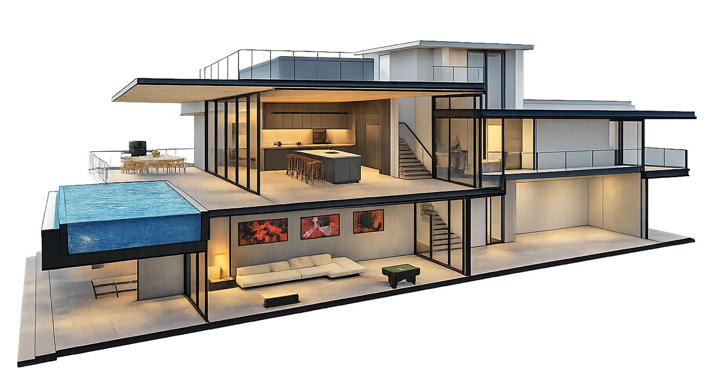 Visitors are welcomed through a dramatic 7-meter-tall entrance gallery, where an exposed concrete wall serves as a raw yet elegant backdrop for curated art pieces. This space sets the tone for the villa’s blend of minimalist sophistication and bold architectural expression.