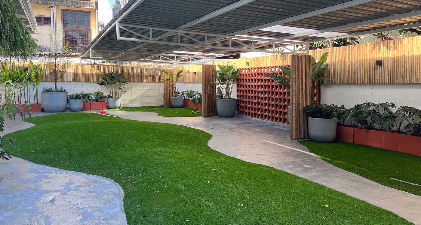 – A partially covered garden with concrete walkways and gently shaped grassy mounds for exploration and play