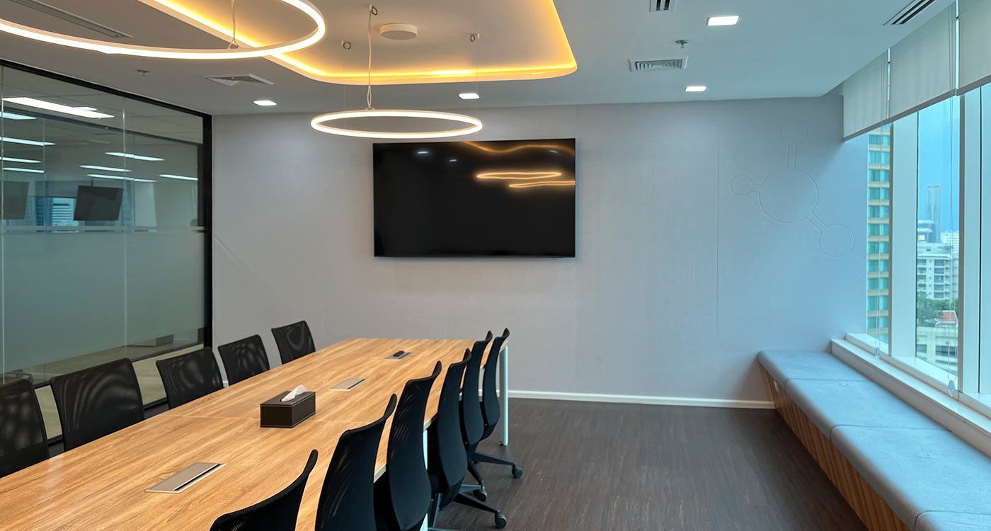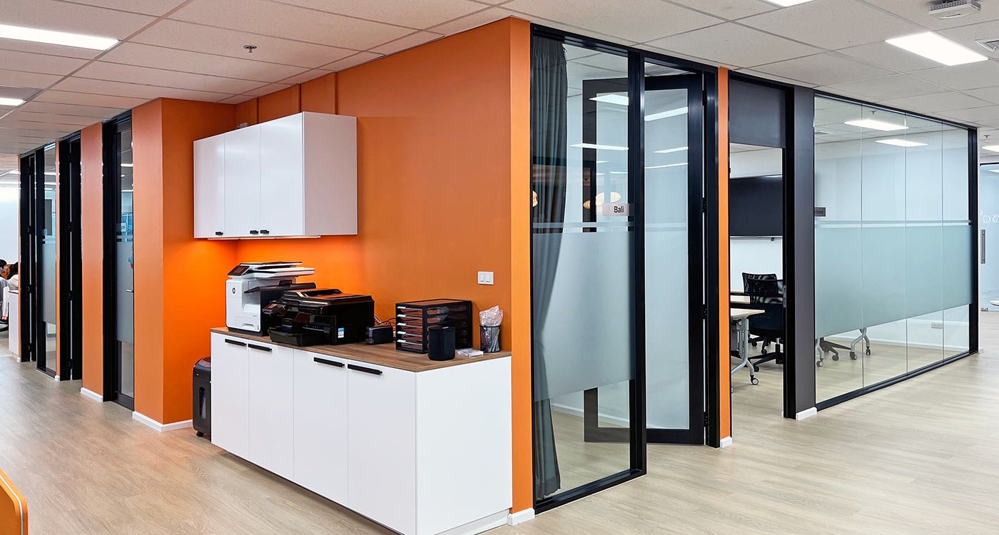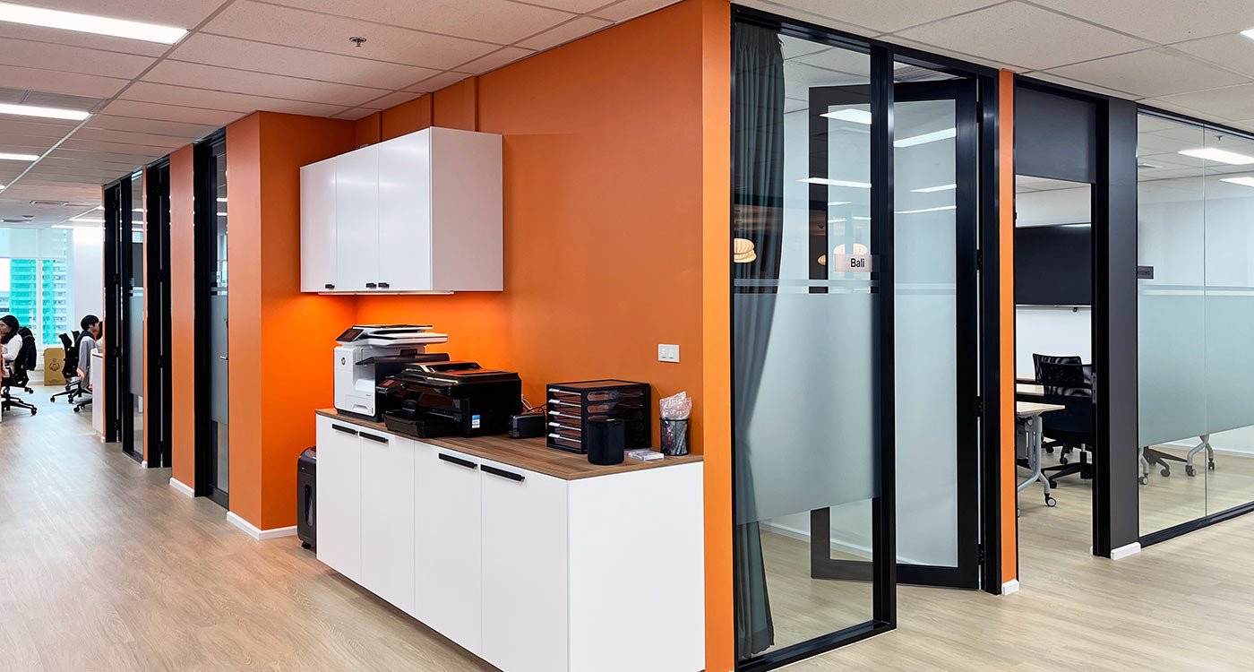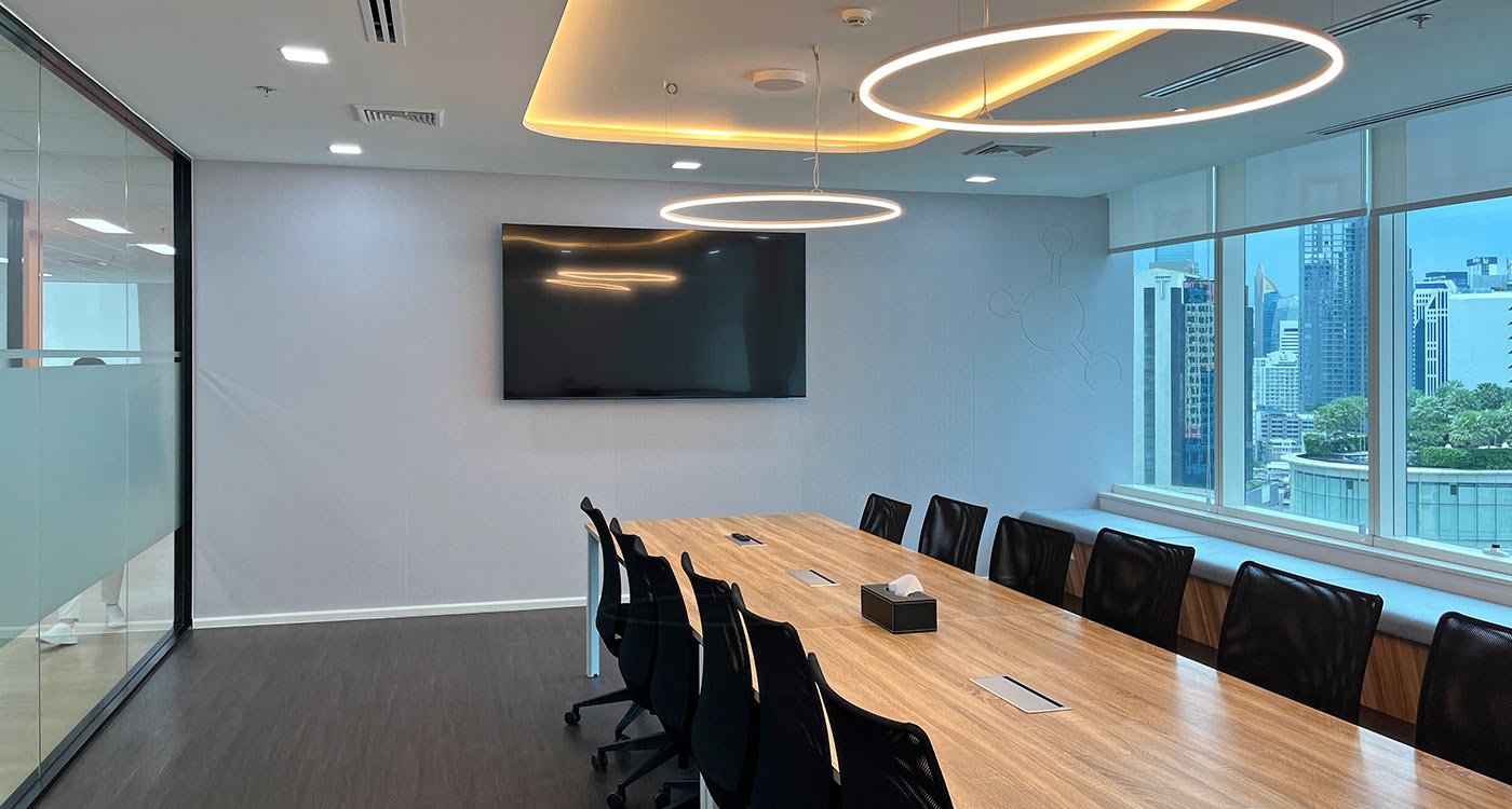 The open office area stretches along the window façade, offering panoramic views over Asok. To balance the openness, a series of enclosed meeting and training rooms form a central core within the floor plan. Integrated into this core are printer and stationery niches, two phone booths for private video calls, and a nursery room for short breaks and rest.