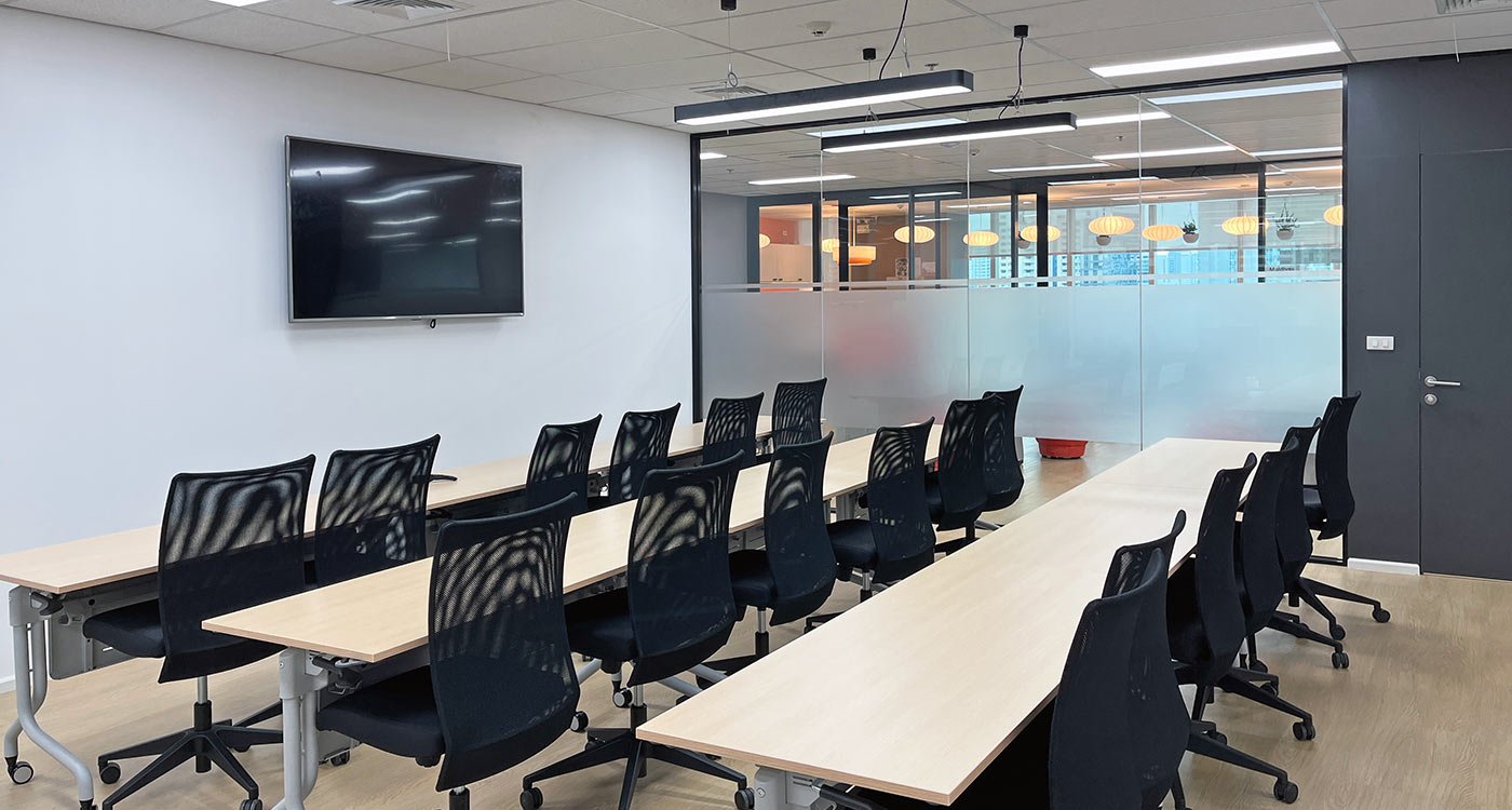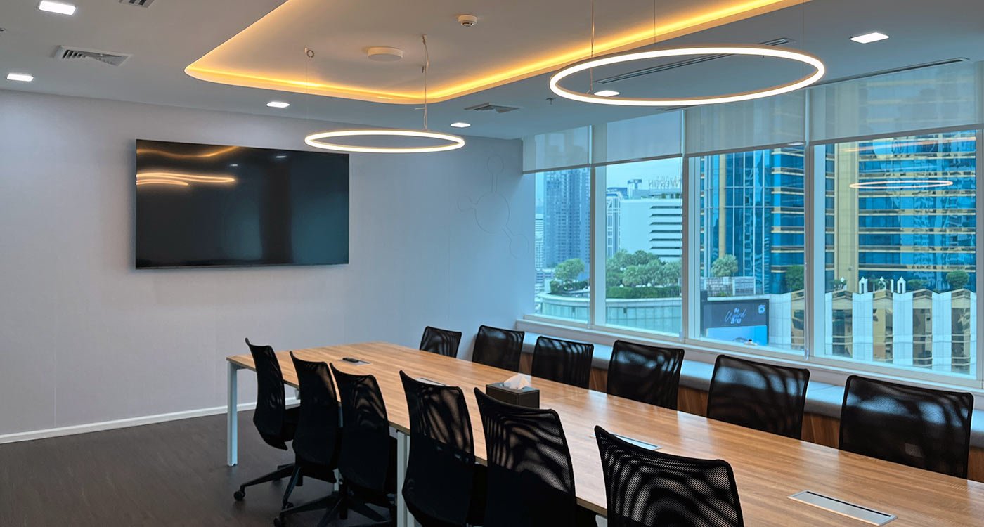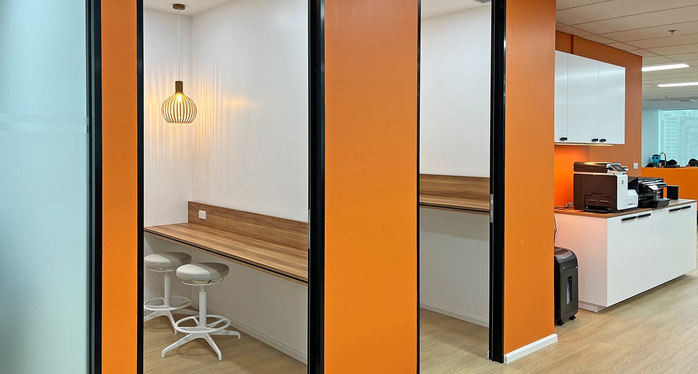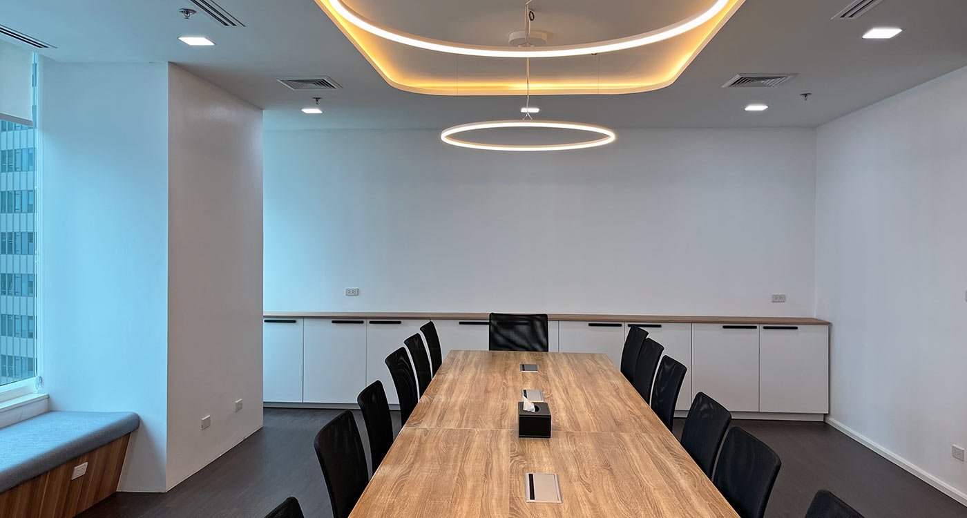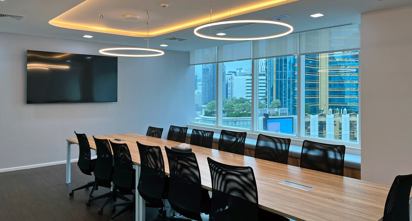 The open office area stretches along the window façade, offering panoramic views over Asok. To balance the openness, a series of enclosed meeting and training rooms form a central core within the floor plan. Integrated into this core are printer and stationery niches, two phone booths for private video calls, and a nursery room for short breaks and rest.