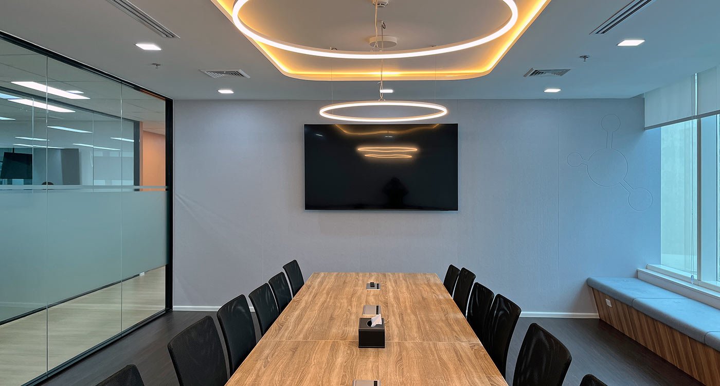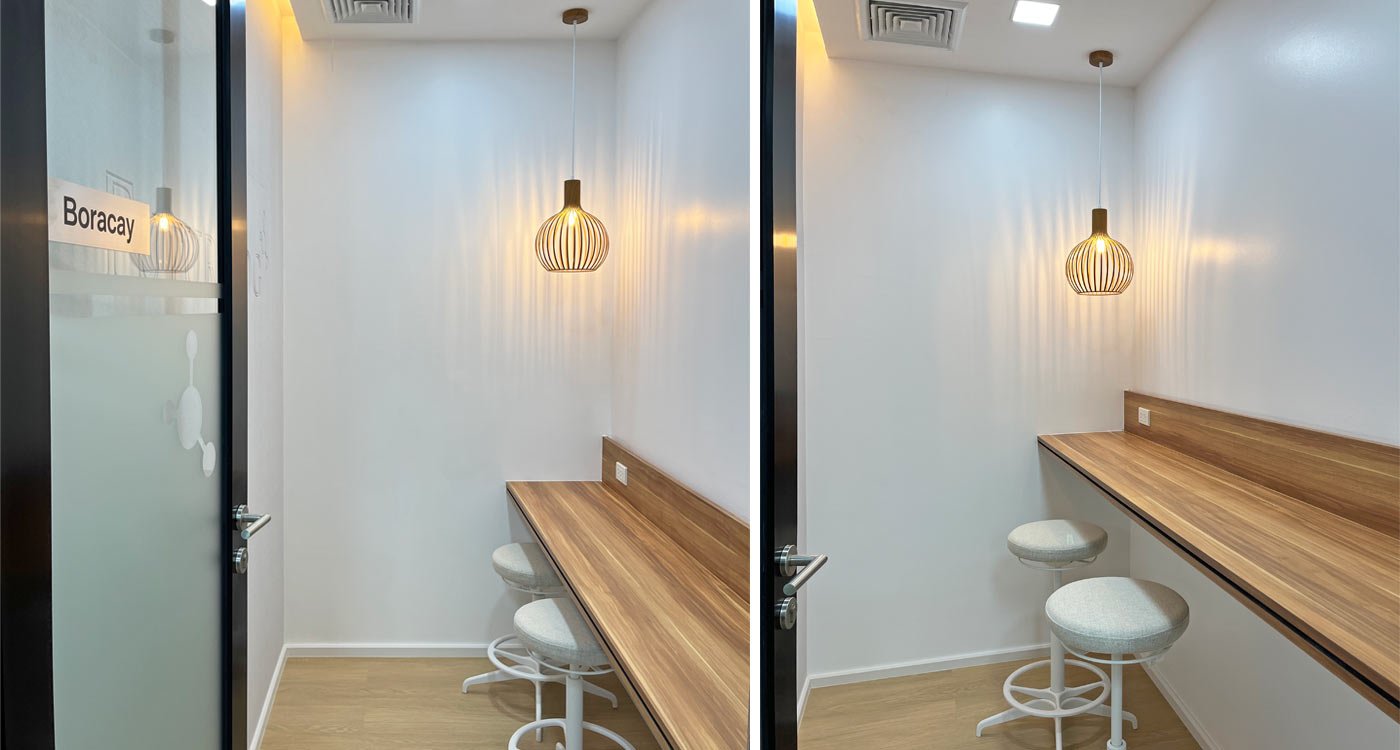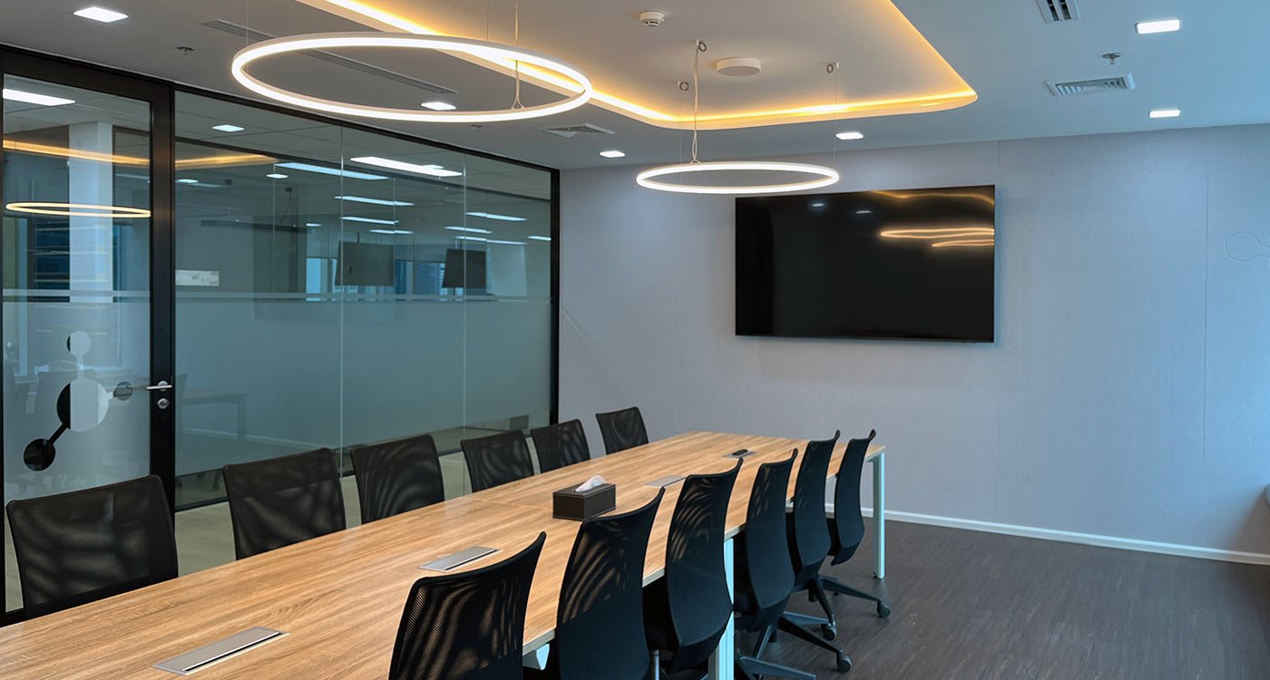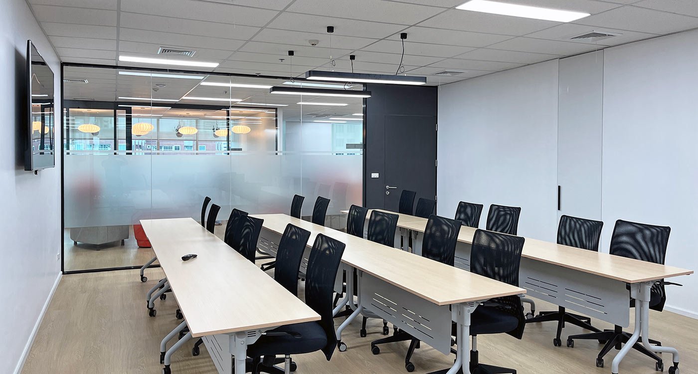 The open office area stretches along the window façade, offering panoramic views over Asok. To balance the openness, a series of enclosed meeting and training rooms form a central core within the floor plan. Integrated into this core are printer and stationery niches, two phone booths for private video calls, and a nursery room for short breaks and rest.