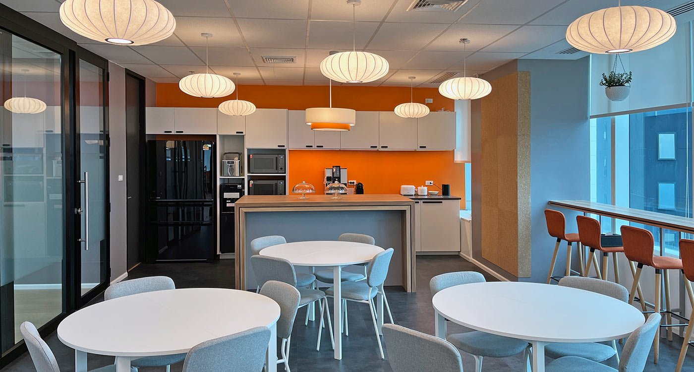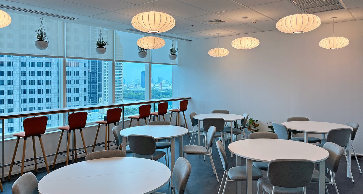 To foster social connection and a healthy work culture, the design features a coffee-shop-style canteen with flexible seating and a bar counter overlooking the Bangkok skyline. Adjacent to it, a multi-purpose lounge area with sofa-style meeting pods can be seamlessly connected to the canteen via a large sliding glass wall, creating a versatile space for gatherings and events.